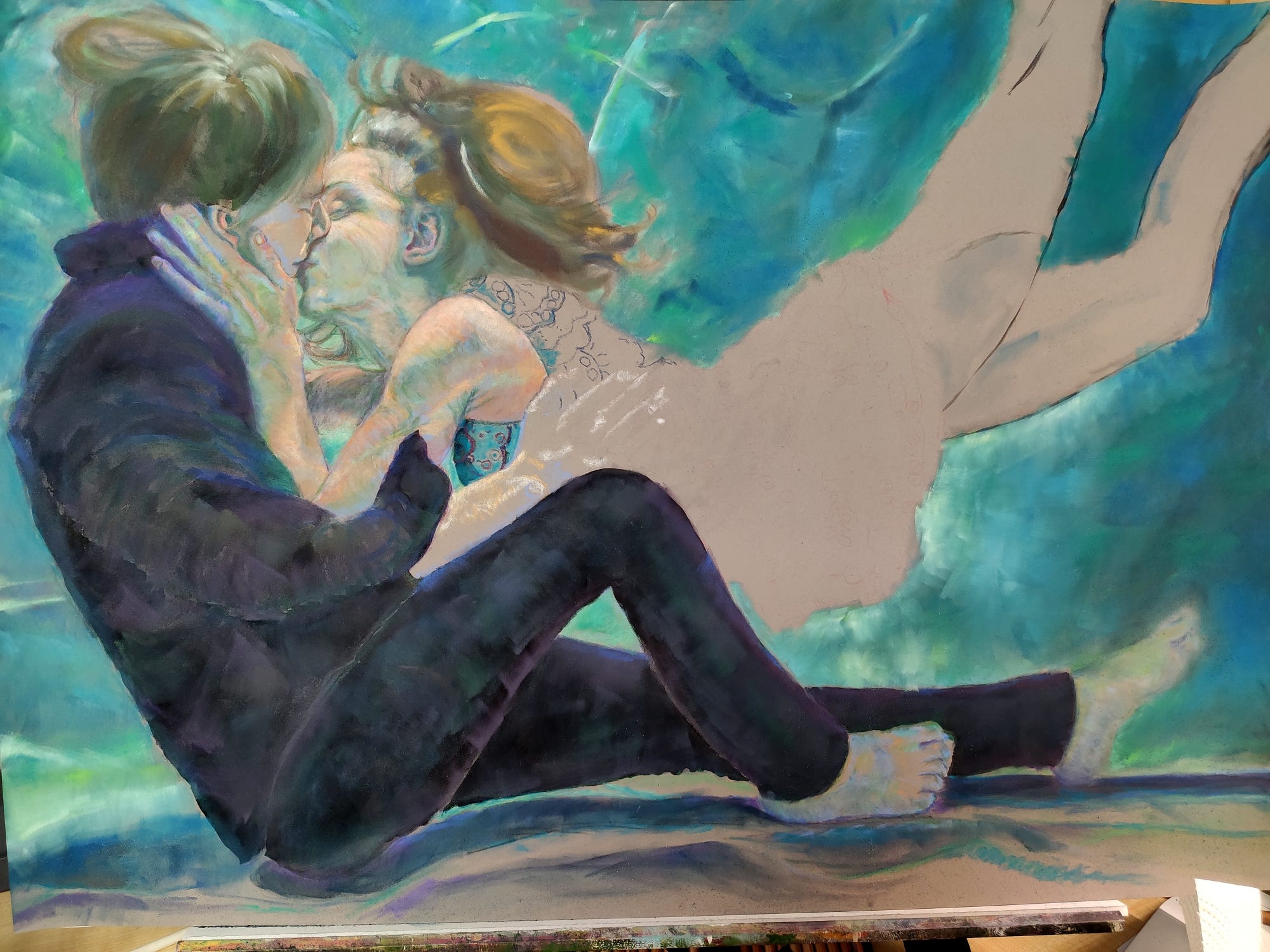 It’s still in the blocking in stage for most of it but you can get a sense of where it is heading - her dress is a complicated puzzle that I’ve just begun but I’ll probably work on his arm next so that I have the tonal values (the lights and darks) sorted before I work on the dress around his hand.